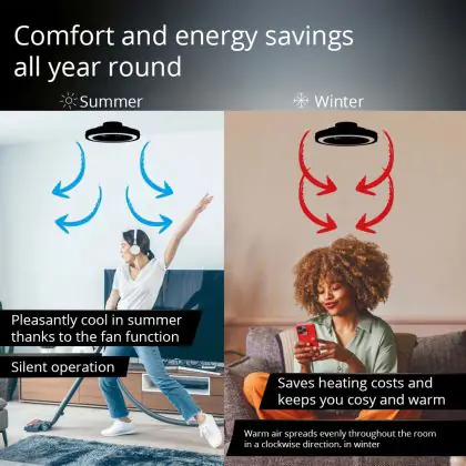 Dank seines flüsterleisen Motors sorgt der Brilliant Mondello Ventilator Plastik Weiß 23W 3100lm - 827-865 CCT | 420mm - Fernsteuerung Dimmbar für angenehme Luftbewegung ohne störende Geräuschkulisse – ideal in Räumen, in denen Ruhe gefragt ist, etwa im Schlafzimmer oder im Home-Office.