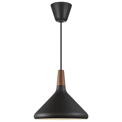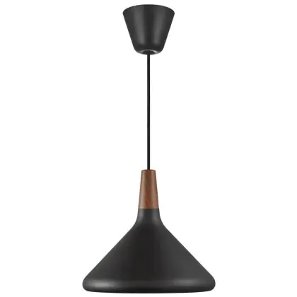 Die Nordlux Pendelleuchte aus der Modellreihe Nori zeichnet sich durch ein modernes Design und einen schicken Materialmix aus. Der Lampenschirm besteht aus Metall. Das Markenzeichen der Modellserie ist die Holzspitze in geöltem Nussbaum. Hinweis: Die Leuchte kommt ohne Leuchtmittel daher - passende E27 LED-Lampen finden Sie jedoch in unserem Shop.