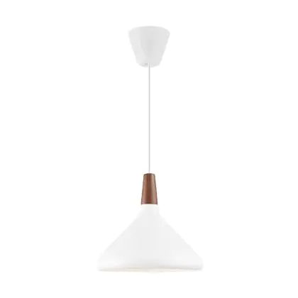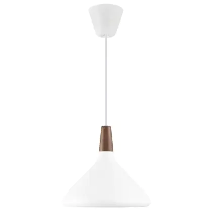Die Nordlux Pendelleuchte aus der Modellreihe Nori zeichnet sich durch ein modernes Design und einen schicken Materialmix aus. Der Lampenschirm besteht aus Metall. Das Markenzeichen der Modellserie ist die Holzspitze in geöltem Nussbaum. Hinweis: Die Leuchte kommt ohne Leuchtmittel daher - passende E27 LED-Lampen finden Sie jedoch in unserem Shop.