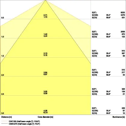 Beispiel: Wird eine Lampe mit einem Abstrahlwinkel von 60 Grad an der Decke (2,5 m Höhe) angebracht, erzeugt sie einen Lichtkegel von 2,9 Metern Durchmesser. Hat die Lampe hingegen einen Abstrahlwinkel von 120 Grad, beträgt der Lichtkegel 8,7 Meter im Durchmesser. |