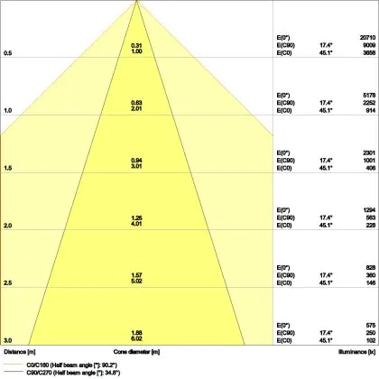 Beispiel: Wird eine Lampe mit einem Abstrahlwinkel von 60 Grad an der Decke (2,5 m Höhe) angebracht, erzeugt sie einen Lichtkegel von 2,9 Metern Durchmesser. Hat die Lampe hingegen einen Abstrahlwinkel von 120 Grad, beträgt der Lichtkegel 8,7 Meter im Durchmesser. |
