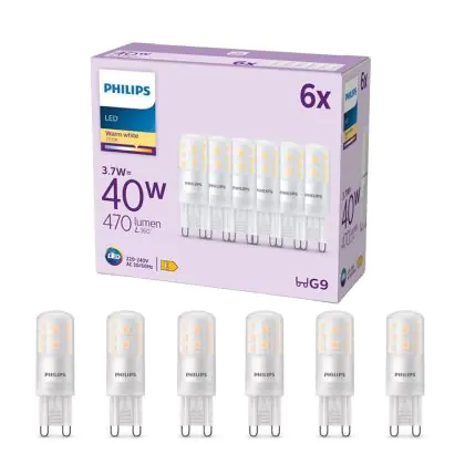 Die Mehrfachpackung 6x Philips LED Capsule G9 Matt 3.7W 470lm - 827 Extra Warmweiß ist eine effiziente G9 LED-Lampe und der perfekte Ersatz für Ihre konventionelle Halogenlampe mit W und einem G9-Sockel. Die Stifte haben einen Abstand von 9 mm. Zudem strahlt das Produkt Licht in der Farbtemperatur 2700K - Extra Warmweiß aus und punktet durch eine lange Lebensdauer.