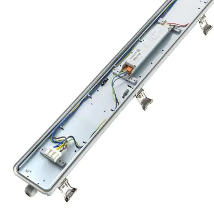 Die LED-Feuchtraumleuchte mit integriertem Philips-LED-Treiber hat eine Länge von 150 cm. Das Noxion-Produkt ersetzt eine herkömmliche Leuchte à 58 Watt. Selbst verbraucht es nur 33 Watt – eine schnelle Amortisation ist damit gewährleistet. Diese LED hat mit einem Wert von 4.000 K eine kaltweiße Farbtemperatur. Sie ist IP66- und IK08-klassifiziert und kann als Notfallbeleuchtung (1 Stunde) eingesetzt werden.