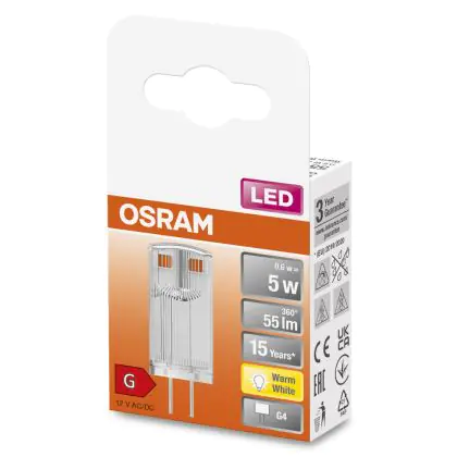 Die Osram LED Capsule G4 Klar 0.6W 55lm - 827 Extra Warmweiß | Ersatz Für 5W ist eine effiziente G4 LED-Lampe und der perfekte Ersatz für Ihre konventionelle Halogenlampe mit 5W und einem G4-Sockel. Die Stifte haben einen Abstand von 4 mm. Zudem strahlt das Produkt Licht in der Farbtemperatur 2700K - Extra Warmweiß aus und punktet durch eine lange Lebensdauer.