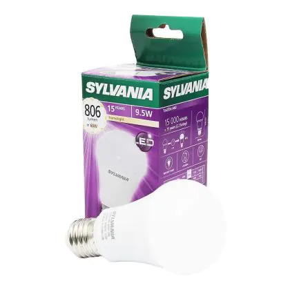 Die Sylvania ToLEDo GLS E27 ersetzt traditionelle Leuchtmittel von 60W, ist dabei aber wesentlich effiziente im Verbrauch mit nur 9,5 W. Darüber hinaus besitzt sie eine extra warmweiße Farbtemperatur und sorgt damit für eine entspannte Atmosphäre.
